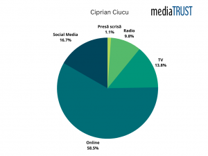 Cele mai active surse TV care l-au menționat pe Ciprian Ciucu în perioada monitorizată au fost Antena3, B1 TV, Pro TV, Realitatea Plus și TVR 1. La radio, posturile care au difuzat cele mai multe mențiuni despre primarul sectorului 6 au fost: Bucuresti FM, Radio Zu și România Actualități.